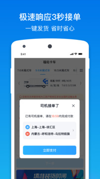 2.极速接单:平均5.8秒推送给附近150名认证司机,十分钟内完成车货匹配,发货不再等待。